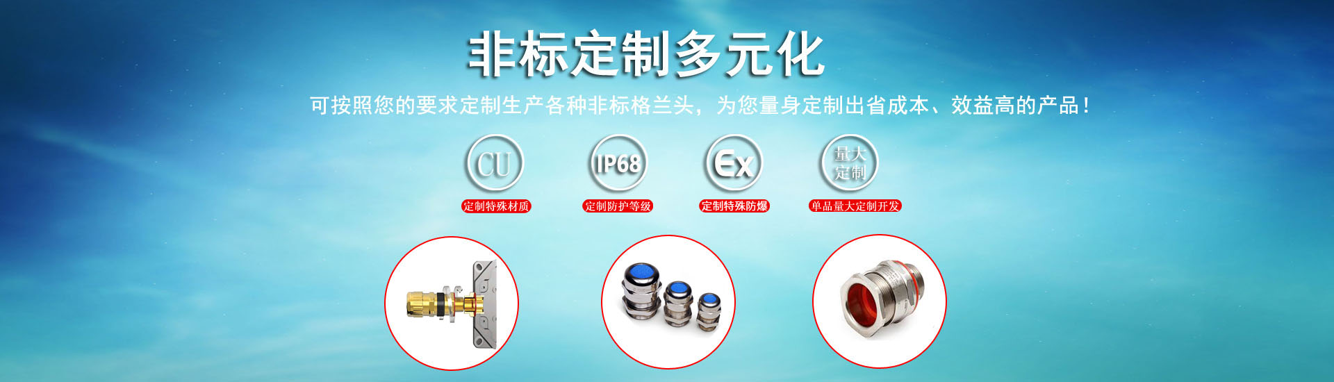 主營產品:不銹鋼(304,316,316L)電纜接頭/格蘭頭,不銹鋼鎧裝電纜格蘭頭,電纜固定頭,不銹鋼電纜接頭,不銹鋼鎧裝防爆接頭,銅接頭,銅質電纜接頭,金屬電纜接頭,